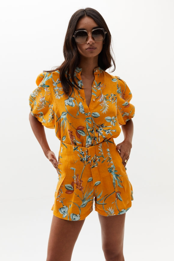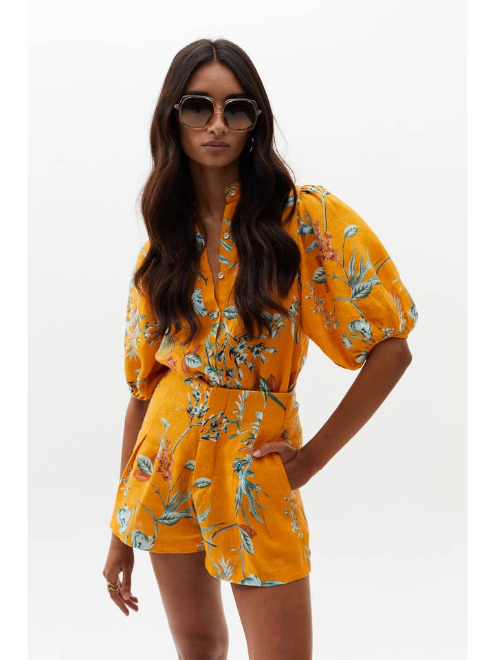 The Bubble linen top is a very feminine and flattering piece for any occasion. Features a mao neckline, button front closure, and puff sleeves.