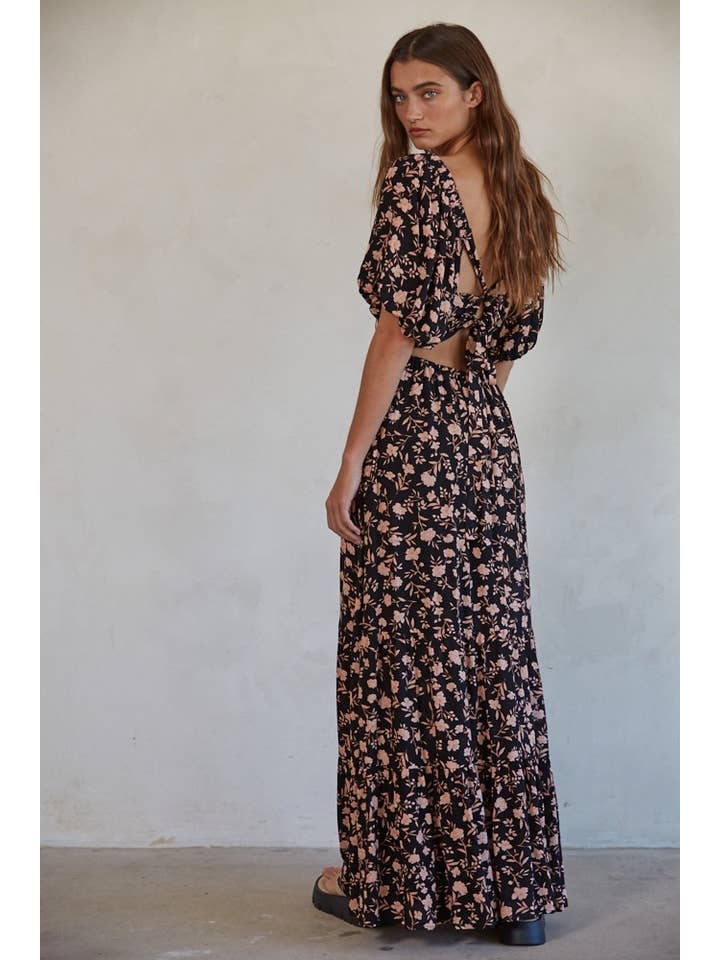 Step into sunshine with the Camellia Maxi Dress in Black Multi! This playful dress features a woven rayon fabric adorned with a lively floral print, a plunging V-neck, and short sleeves that keep things breezy. The open back with crossed tie straps adds a flirty twist, while the smocked waist ensures a comfy, flattering fit. Fully lined and flowing into a maxi flare, it’s perfect for twirling through warm days and starry nights.