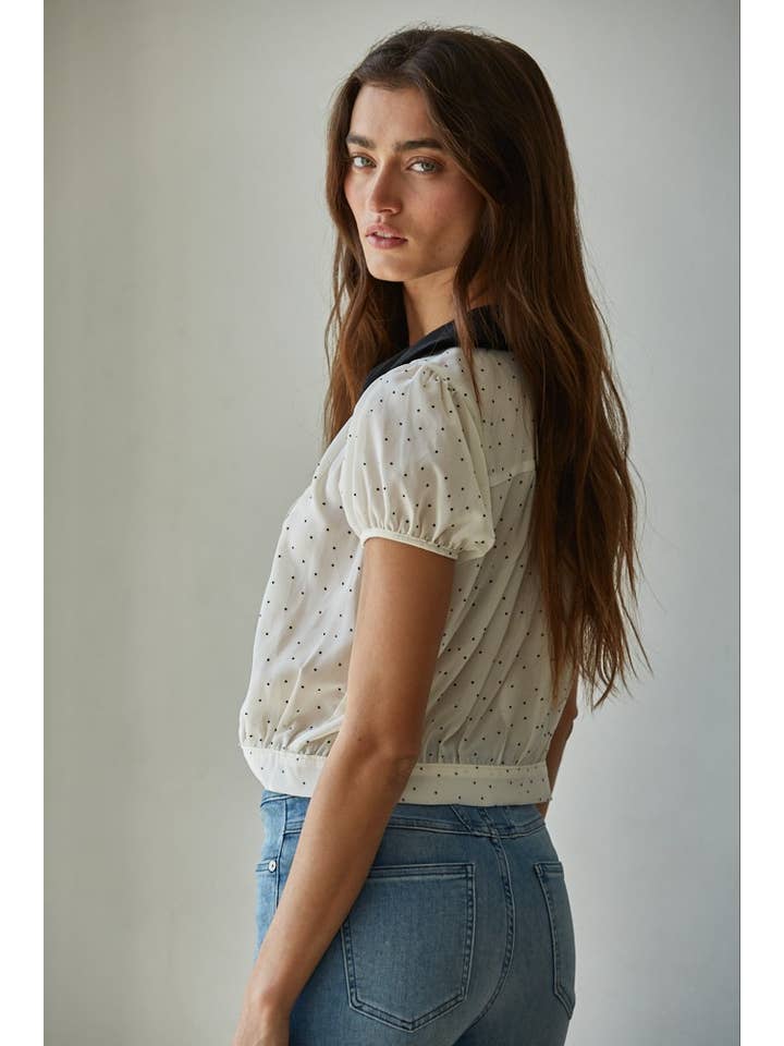 Add a touch of whimsy to your wardrobe with this cream chiffon blouse featuring a delicate velvet dot pattern. The charming Peter Pan collar and puffed short sleeves bring playful elegance, while front pintucks and sparkling rhinestone buttons add subtle sparkle. Finished with a banded hem for a flattering fit, this blouse blends texture and style effortlessly. Perfect for dressing up or down with a fun, feminine flair.