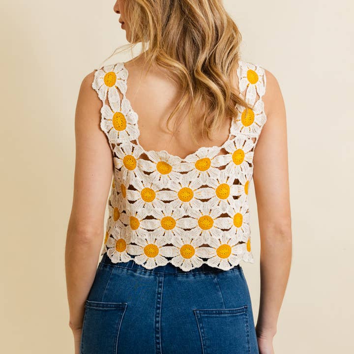 Boho-Chic Crochet Sunflower Top. Embrace the summer vibe with our Bohemian-style, crochet-knit sunflower top. This sleeveless, textured blouse is a must-have. Crafted with artisanal flair, it adds a vintage-inspired touch to any wardrobe.
