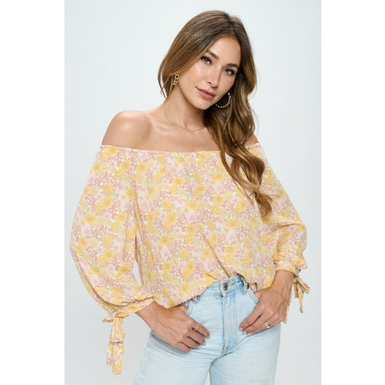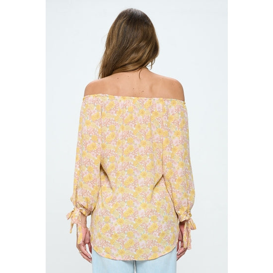 Bright colored off the shoulder top in a fun floral print with ties on the sleeve.