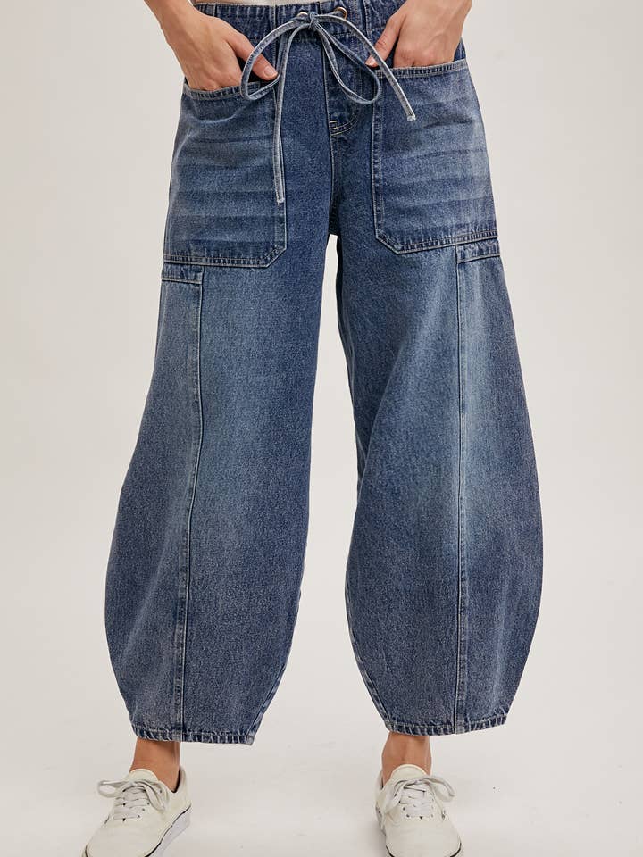 Denim mid-waist drawstring barrel jeans offer a relaxed yet stylish look. Featuring a mid-rise waist with an adjustable drawstring, these jeans provide a comfortable fit that blends casual ease with modern flair. The barrel-leg silhouette adds a contemporary touch, giving a slightly voluminous shape that tapers at the ankles. Perfect for everyday wear, they can be styled with a simple tee or a cozy sweater, making them a versatile addition to any wardrobe.
