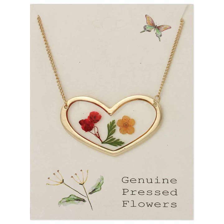 Bring home cottage style with genuine pressed flower jewelry! This delicate gold large heart necklace features dried yellow and red flowers set in clear acrylic with a gold border. Natural and sweet vintage design with red flowers and green leaves.