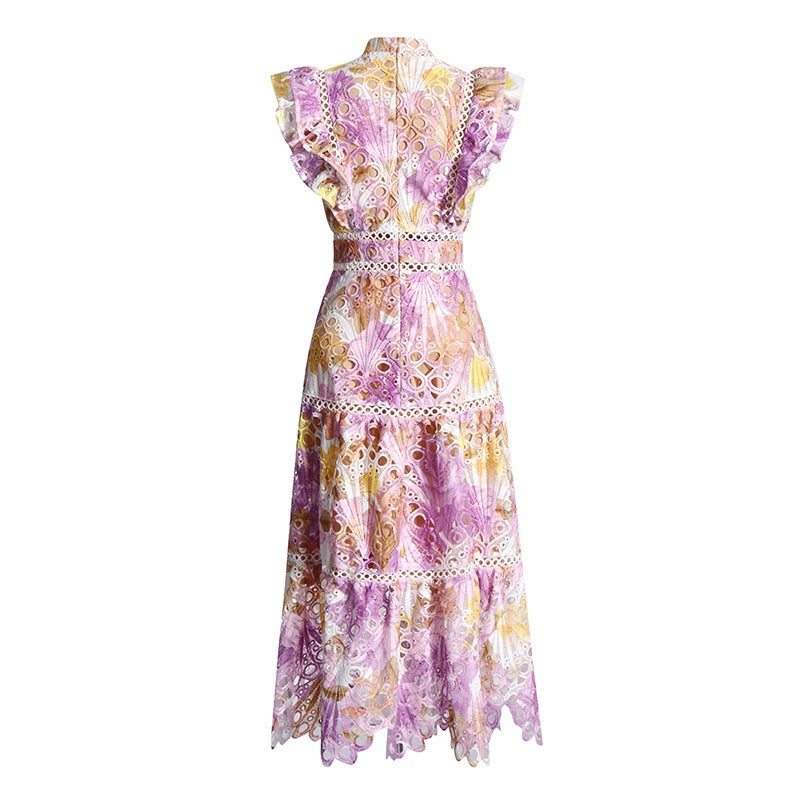This exquisite dress features a stand collar and sleeveless design, adorned with intricate lace and embroidery. The hook flower pattern adds a touch of elegance, while the tiered skirt creates a flattering silhouette. Perfect for any special occasion, this dress combines timeless style with modern sophistication. The soft pastel colors and delicate detailing make it a standout piece in any wardrobe. Ideal for women who appreciate fine craftsmanship and unique fashion. The dress's flowing fabric and detailed design ensure both comfort and elegance, making it a must-have for your wardrobe.