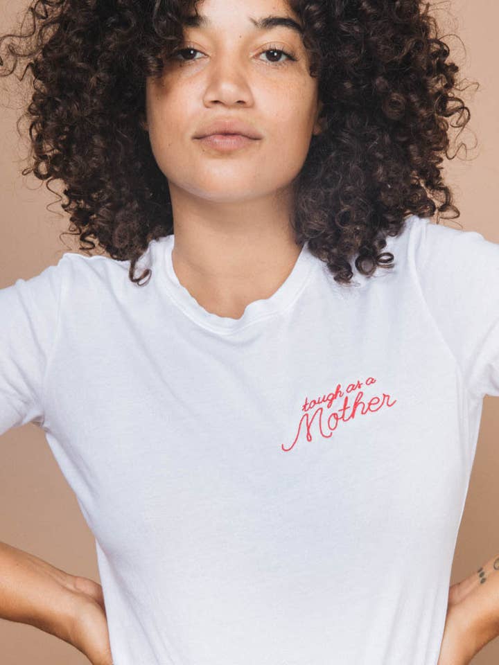 Embroidered detailing on a white t-shirt. Fabric is a soft, 100% cotton. Recommended sizing: size up by one for a fitted look, by two if you prefer a looser fit. We recommend washing in cold water, on the delicate cycle. Tumble dry low heat.