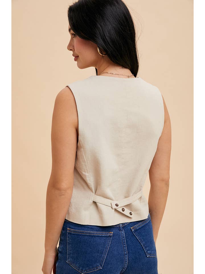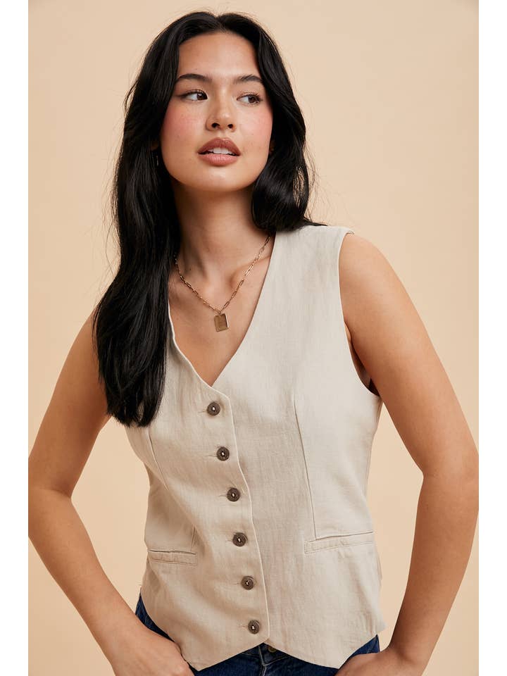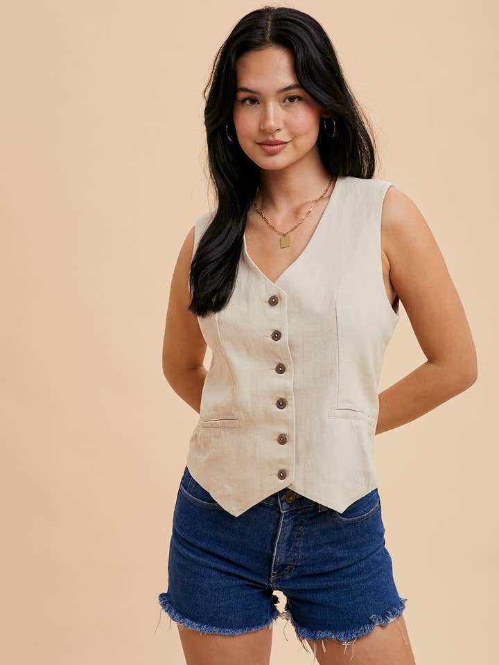 Add a dash of charm to your wardrobe with this playful Everyday Vest in Linen. Crafted from breathable linen cotton, it features fun coconut buttons and a flattering V-neck. Sleeveless and semi-fitted, it offers comfort with a stylish edge. Non-functional pocket accents add a quirky touch, while the button tab at the back lets you adjust the waist for the perfect fit. Perfect for layering or wearing solo, this vest brings effortless style to any outfit.