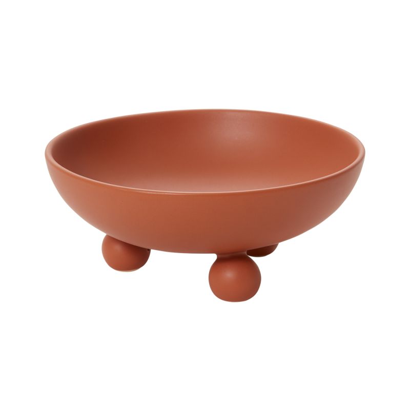 The wide-mouthed Farley Bowl offers a clean silhouette, a matte terracotta colored finish and sphere-shaped feet for modern style in your home. Use it in a variety of ways - store fresh fruit on the counter, as a catchall in the living room, or in the bathroom to hold washcloths and skincare.