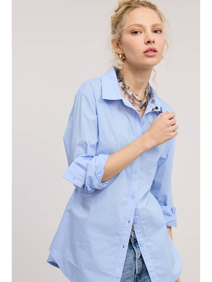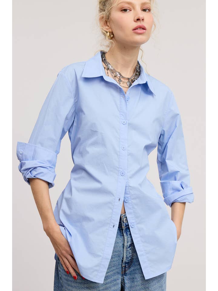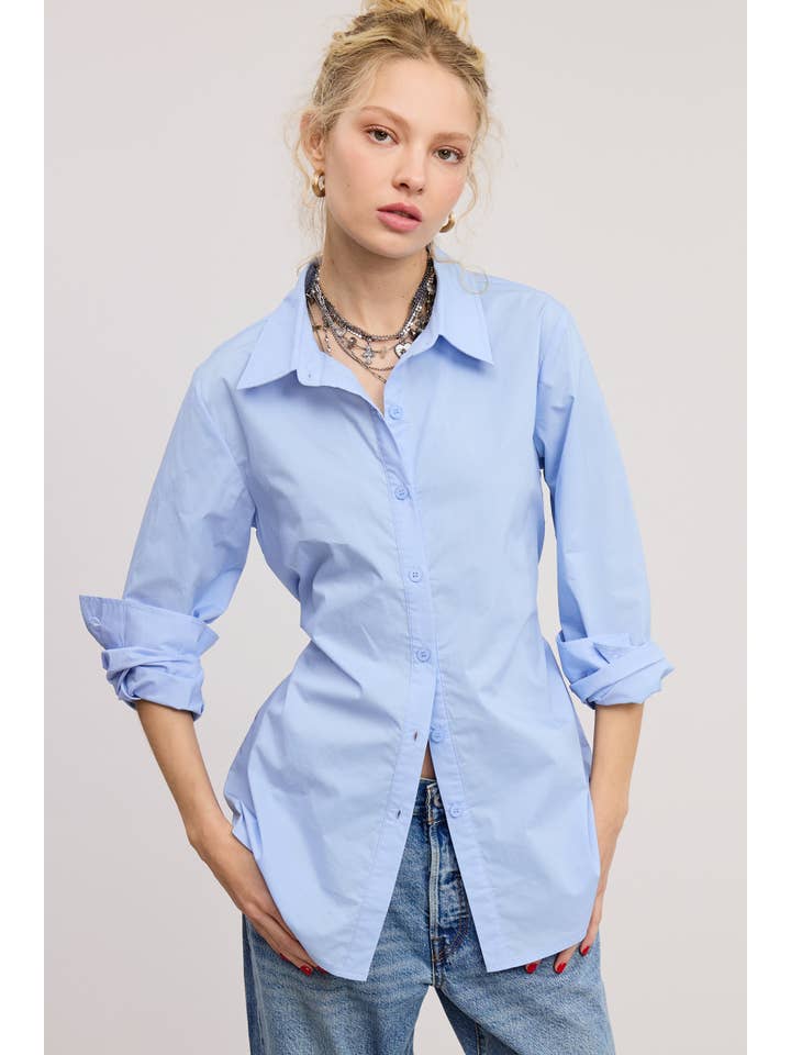 This playful long-sleeve blouse brings a fresh twist to the classic button-down. Its fitted silhouette flatters your shape, while the self-tie ribbon at the back adds a charming touch of structure and personality. Perfect for dressing up or down, this blue beauty keeps your look effortlessly fun and polished all day long.