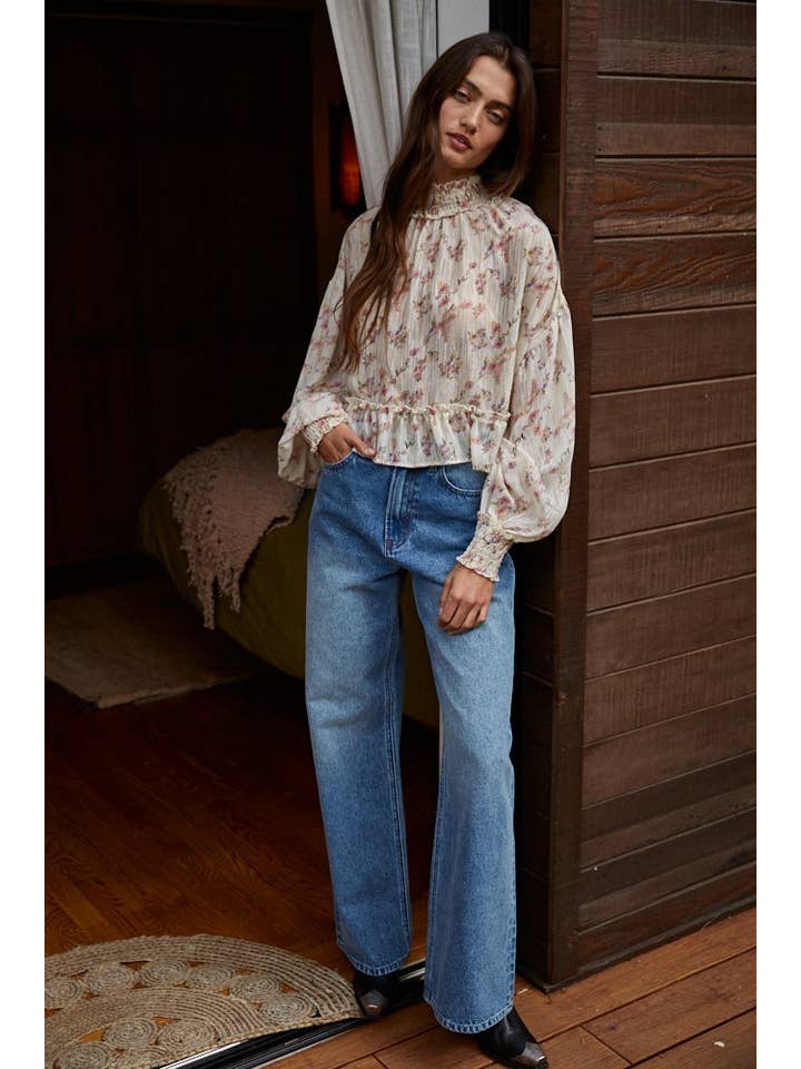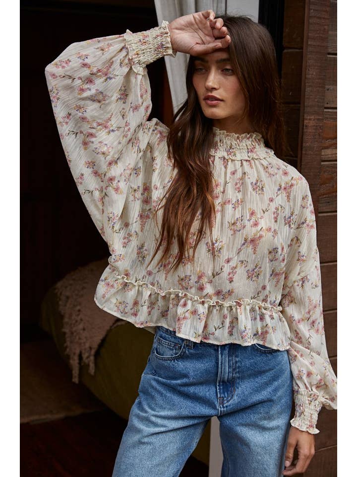 This cream-colored blouse brings a playful twist to your wardrobe with a delicate floral print on lightweight woven polyester. Its see-through fabric and smocked mock neck add flirty charm, while ruffled details and long sleeves create a fun, feminine silhouette perfect for day-to-night wear.