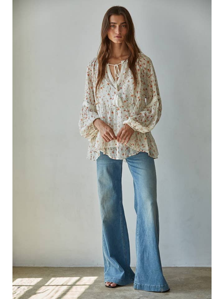 Embrace effortless charm with this Floral Print Wide Neck Top in Ivory Multi. Featuring a breezy raglan long sleeve design, a soft rayon cami lining, and a flirty V-neck slit, it’s perfect for playful days and romantic evenings. The tied neck straps with tassel trims add a whimsical touch that dances with every move. Light, comfortable, and full of personality, this top brings a fresh, fun vibe to your wardrobe.