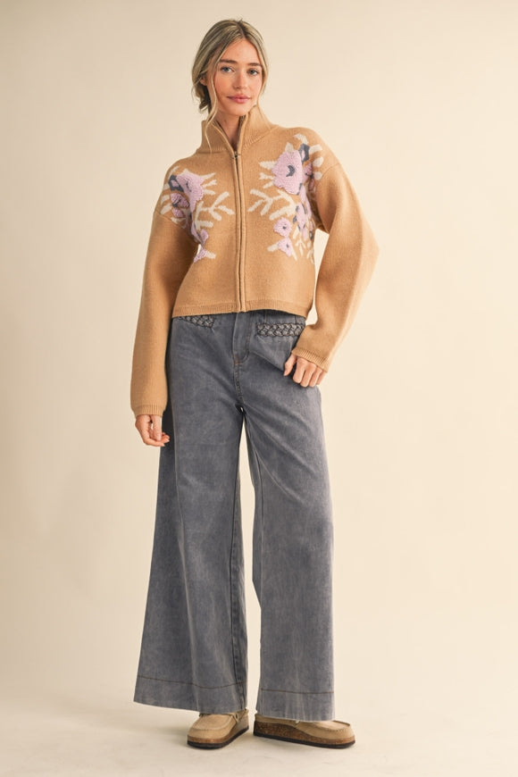This Floral Zip Cardigan in Taupe Flower brings a fun twist to cozy layers. Featuring a ribbed stand collar and a smooth zipper closure, it’s easy to throw on for any adventure. The drop shoulder puff sleeves add a playful pop, while ribbed cuffs and hem keep the fit snug and comfy. Perfect for brightening up your casual days with a touch of floral charm!