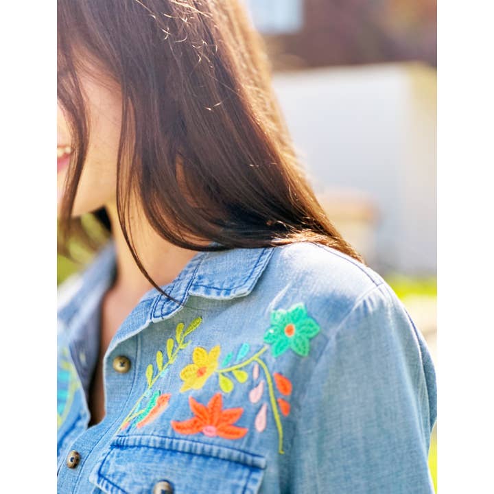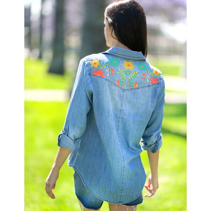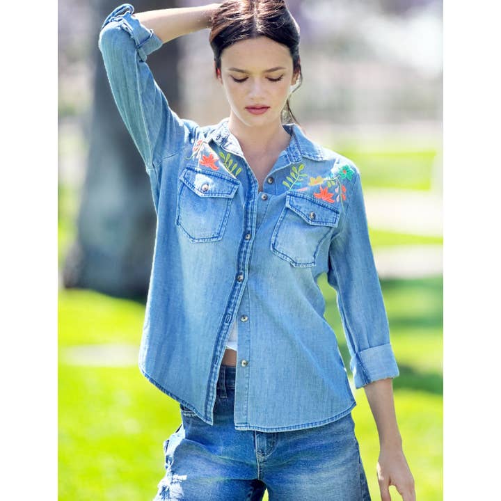 Step back in time with our Flower Field Embroidered Shirt! This blast from the past denim top features vibrant 70's floral embroidery for a fun and playful look. Add a touch of vintage style to your wardrobe today.
