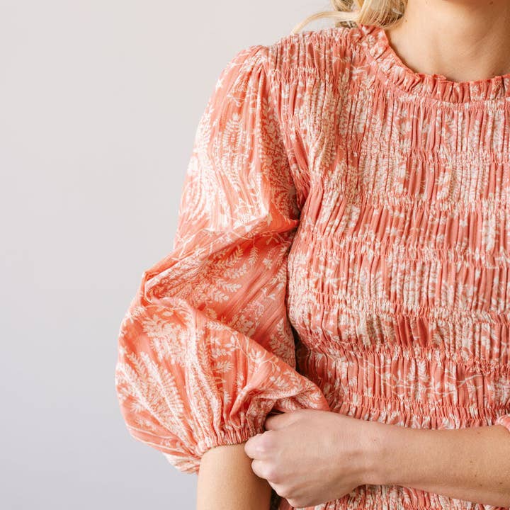 The Rose Gilded Palm Hali Top exudes elegance with its delicate palm print in soft rose hues and shimmering accents. Featuring pleated details and voluminous sleeves, it’s a refined choice for both daytime and evening occasions.