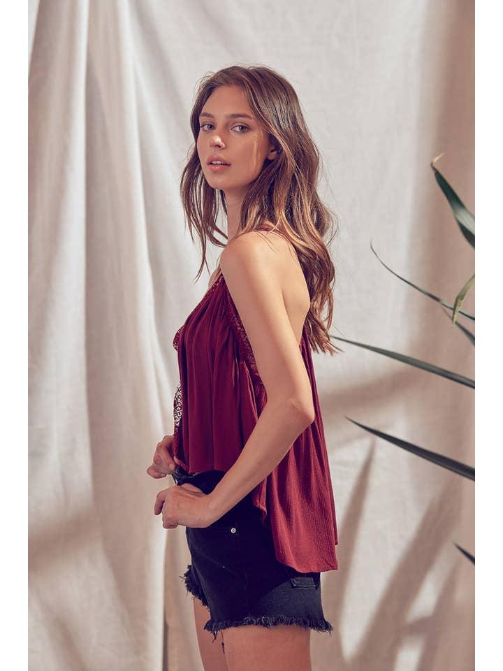 This Hi-Lo Hem Cami Top in a rich wine shade adds a flirty twist to your wardrobe. Featuring delicate lace trim, adjustable spaghetti straps, and a deep V neckline, it offers a perfect blend of comfort and style. The playful flounce body creates movement and charm, making it ideal for day-to-night adventures.