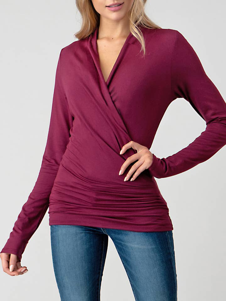 Wrap yourself in effortless style with our Long Sleeve Wrap Style Top. The surplice front and fitted top create a flattering silhouette, while the long sleeve design keeps you warm and comfortable. The pleat detail on the side adds a touch of unique charm. Made from ecological premium quality modal span jersey, this top is both fashion-forward and environmentally friendly.