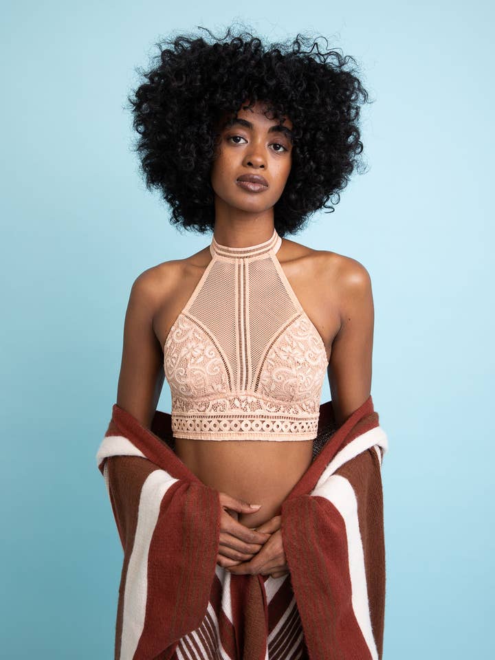 Elevate your style with this playful Mesh Lace Halter Bralette in a soft peach/nude shade. Featuring a high neck mesh choker design, it adds a flirty edge while offering lightweight comfort. Perfect for layering or wearing solo, this bralette blends delicate lace with modern mesh for a chic, breathable look that’s as fun as it is fashionable.
