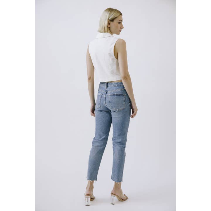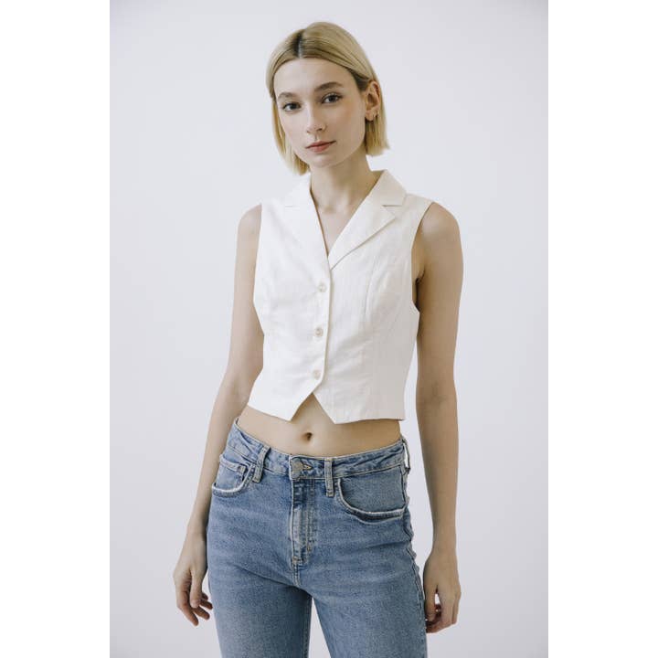 This ivory monochromatic vest combines the natural comfort of linen and cotton with a playful twist. Featuring a chic notched collar, flattering front princess seams, and bold large buttons, it shapes a fitted silhouette that’s both stylish and fun. Perfect for adding a touch of effortless charm to any outfit!