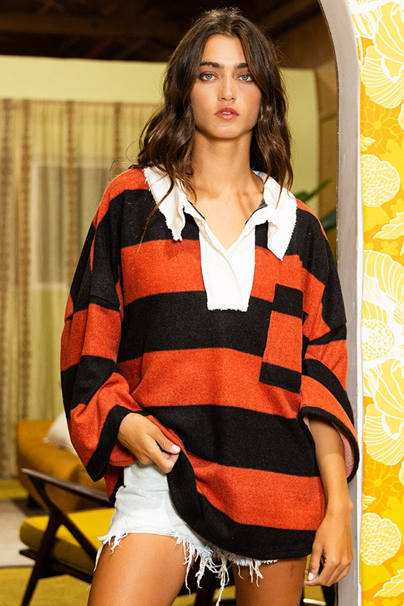 Score with this sporty and comfortable Rugby Stripe Pullover Top in Rust. The stripe print stretch fabric and wide bell sleeves offer ease of movement while the spread collared neck and raw edge details add a touch of style. Keep your essentials close by with the chest pocket and rock the oversized silhouette like a champ!