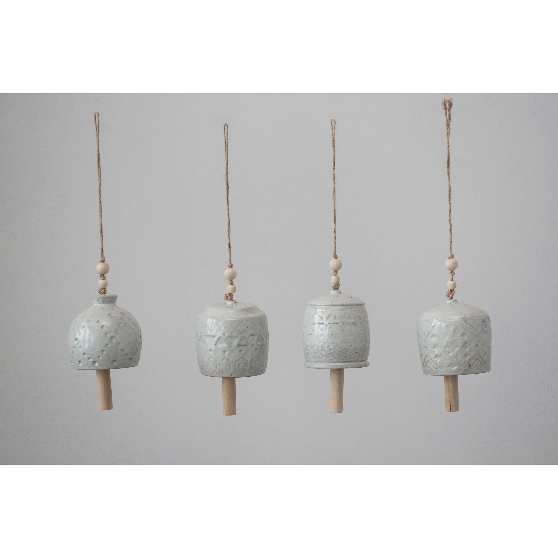 Decorate your home or garden with these stoneware bells! Featuring a neutral color and a truly one-of-a-kind reactive glaze finish, the debossed pattern gives just the right touch of texture. Find your favorite pattern or collect them all for a unique and charming windchime. Includes a string for hanging, each with wood bead detailing!