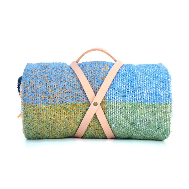 Your new blanket comes rolled up with a handmade leather strap, making it ready for any adventure. Our original blanket designs are created by us at our home base in the Bay Area and hand woven in Mexico by skilled artisans. Our leather straps are hand-made by us out of vegetable tanned leather that ages nicely with use.
