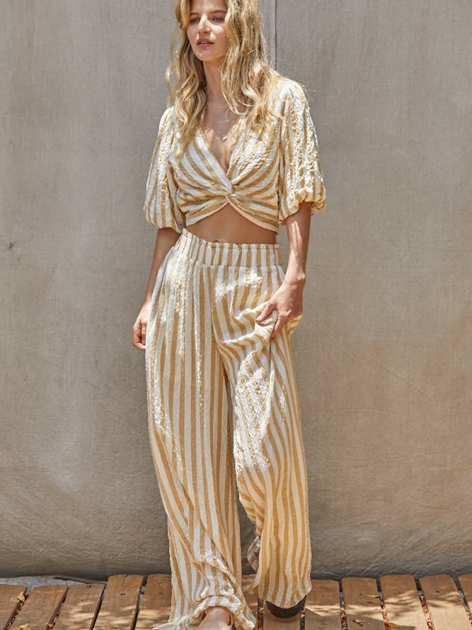 This Textured Striped Crop Top is ready for some summer fun! Get flirty in the twist crop top style - perfect for staying cool during those beach days. Includes a side zipper for easy dressing.