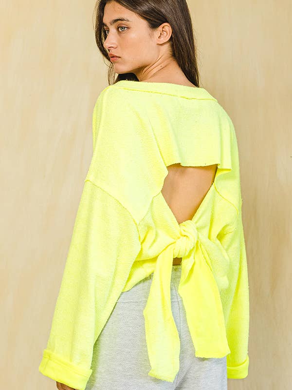 Add some playful flair to your wardrobe with our Tie-Back Cropped Top! The V-neckline, dropped shoulders, and raised seam detailing create a slouchy, oversized fit. But the real fun is in the back, with a cute cutout and adjustable tie for a touch of quirky charm.