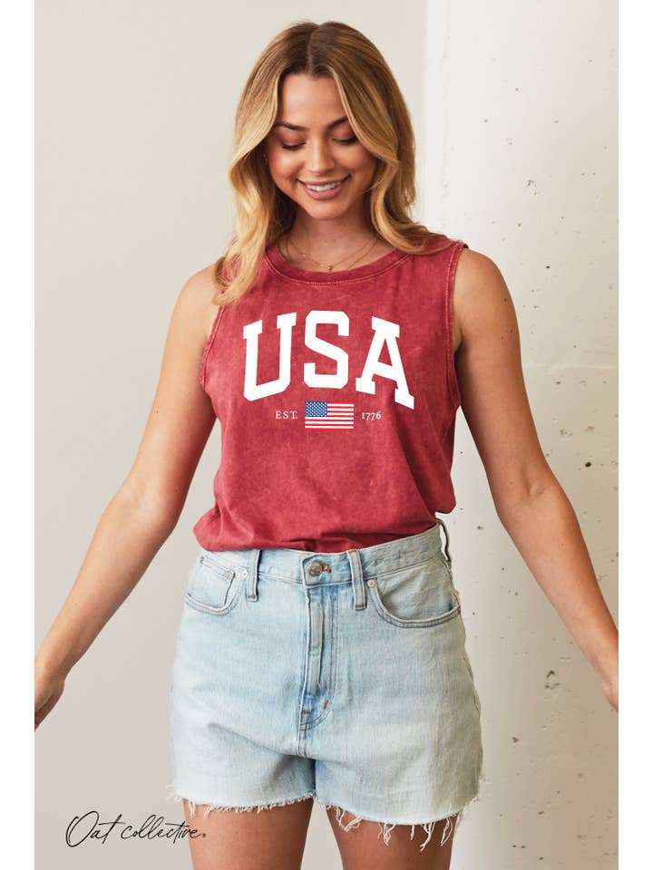Stay cool and comfy in the USA Est.1776 Mineral Tank - Cardinal. Its relaxed fit lets you move with ease, while the vibrant screen-printed design uses eco-friendly water-based ink for a soft, breathable feel. Perfect for showing your patriotic spirit with a splash of style!