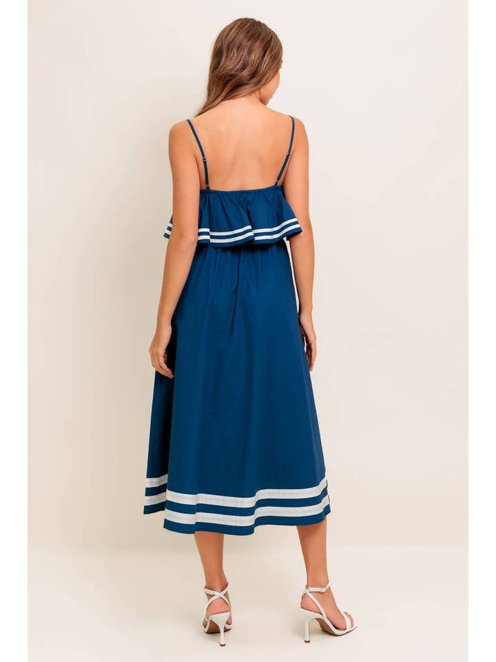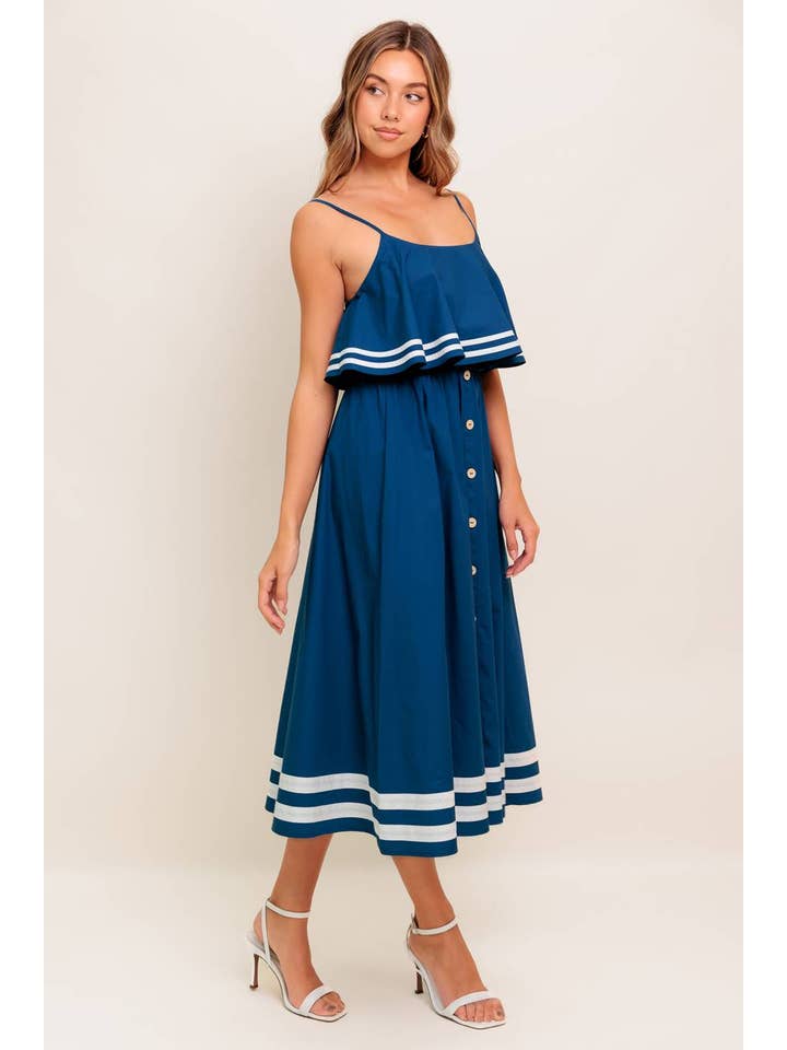 This playful woven midi dress in navy and white features a flattering U neckline and delicate straps for a breezy feel. The pop-over design adds a fun twist, while the button-down skirt lets you adjust your look with ease. Perfect for sunny days and casual outings, it combines comfort and style effortlessly.
