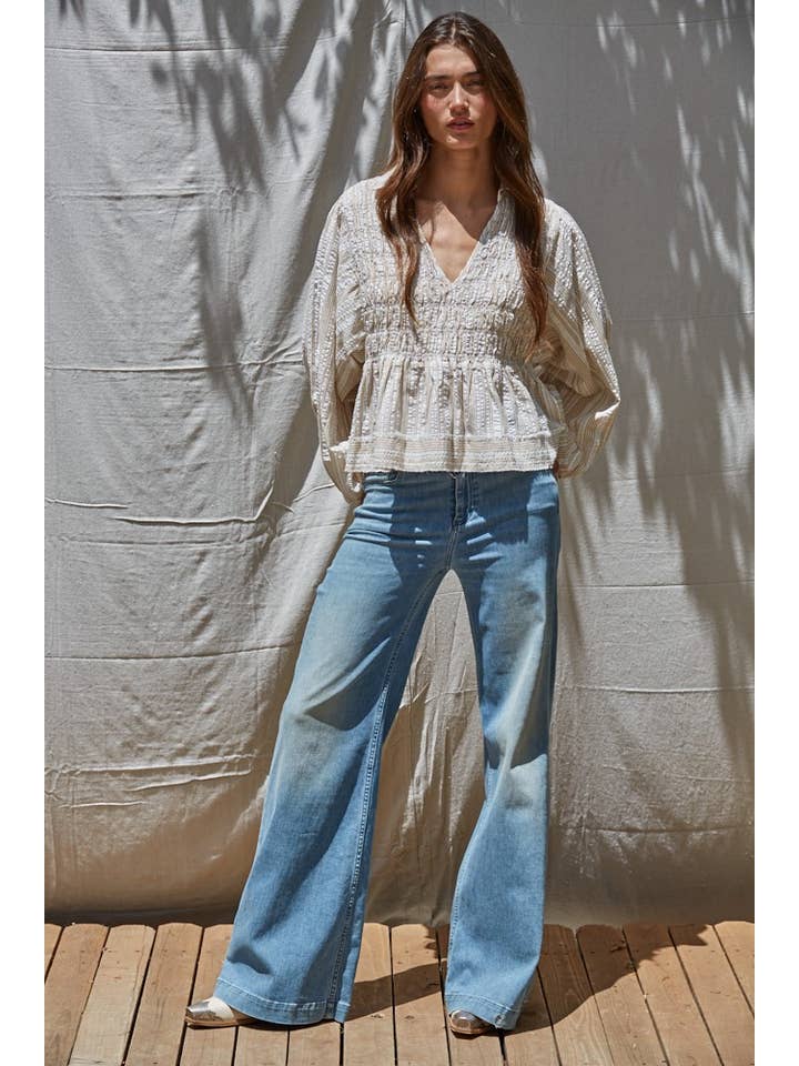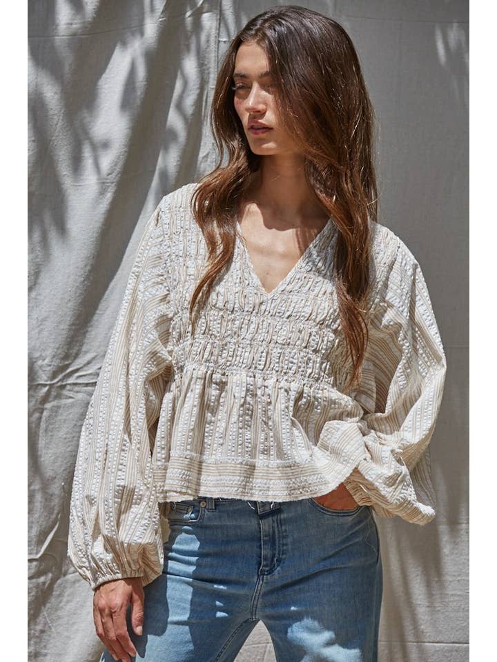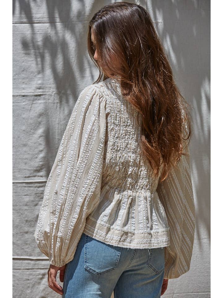 Add a dash of charm to your wardrobe with this Woven Smocked Top in Ivory Taupe. Featuring a playful striped pattern, a flattering scoop neck, and smocked detailing that hugs just right, this long sleeve top pairs perfectly with your favorite jeans or skirts for a laid-back yet stylish look. The collared design adds a touch of sophistication, making it a versatile piece for both casual days and fun outings.